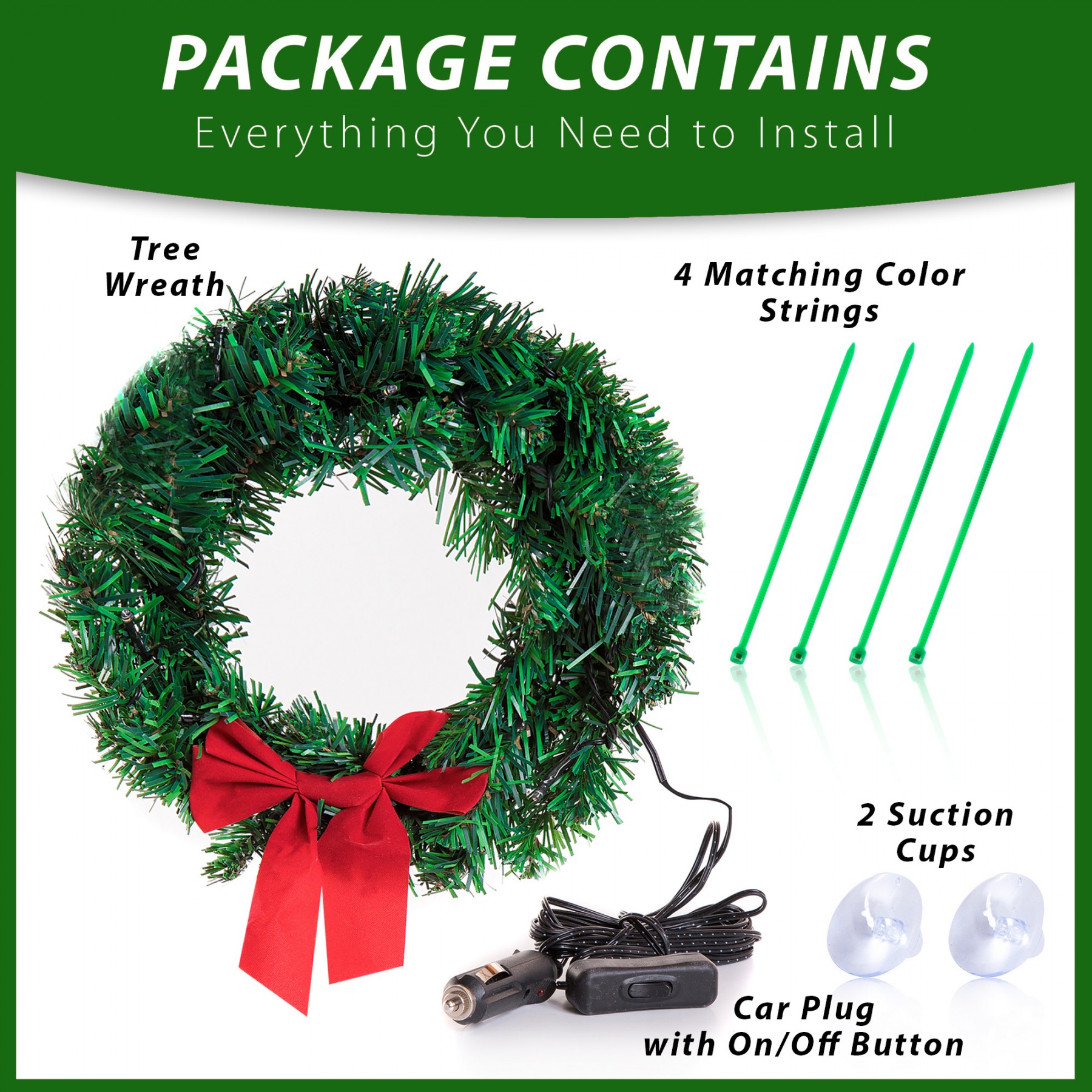 PLUG AND PLAY The Zone Tech Christmas Wreath comes with long cord that plugs instantly into any standard 12-volt cigarette port. No need to splice cables or install complicated hardware. WIDE APPLICATION The Christmas car wreath can be used to decorate the front of your car, truck or SUV and many other types of vehicle. Hang it in your door, wall, fireplace, window, home, office and other places, welcoming the arrival of Christmas. The Zone Tech Christmas car wreath requires zero effort and hassle free installation. It includes 2 suction cups and 4 strings. Mount it to your vehicle’s front conveniently....View More - Specification