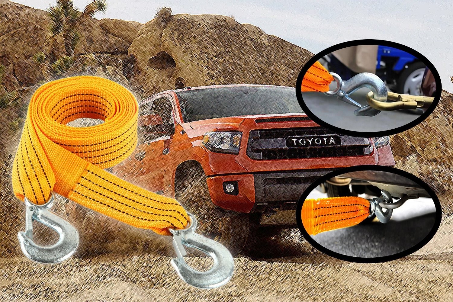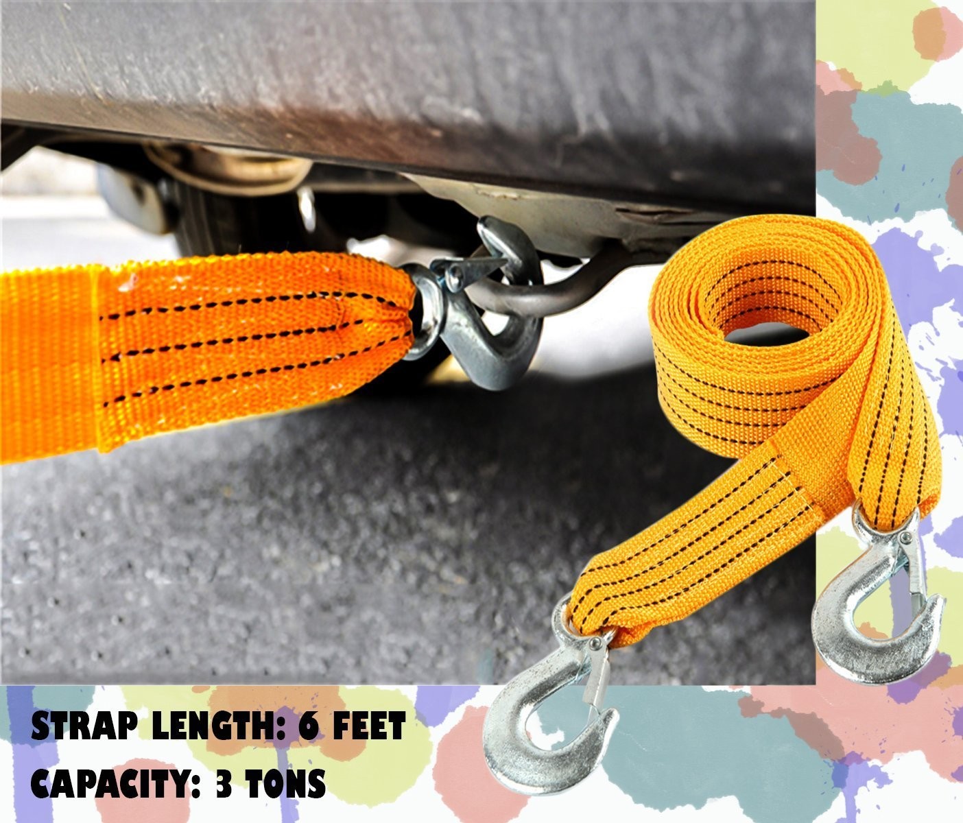 HEAVY DUTY - The 6 feet strap is made from very sturdy materials which allows it to pull up to 3 tons! The forged hooks allow you to attach one end to another. Each hook has safety latch that prevents it from falling off the car or makes it easie...View More - Specification