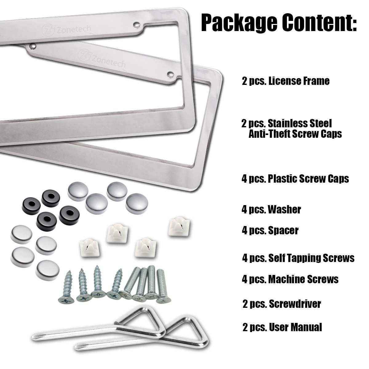 ► SMART DESIGN - The Zone Tech license plate frame is designed not to block registration tags in all four corners. ► DURABLE - The Zone Tech license plate frame is lightweight, strong, and rust-free. It is powder coated black matte finish, so it will never peel off. ► PREMIUM QUALITY - The Zone Tech license plate frame is made from premium quality aluminum to ensure maximum strength and durability for long lasting usage. ► USER FRIENDLY - The Zone Tech license plate frame is user friendly and is easy to install. See back of package for installation instructions. It installs in minutes with no special tools required. ► STANDARD FIT - The Zone Tech license plate frame is designed...View More - Specification