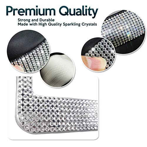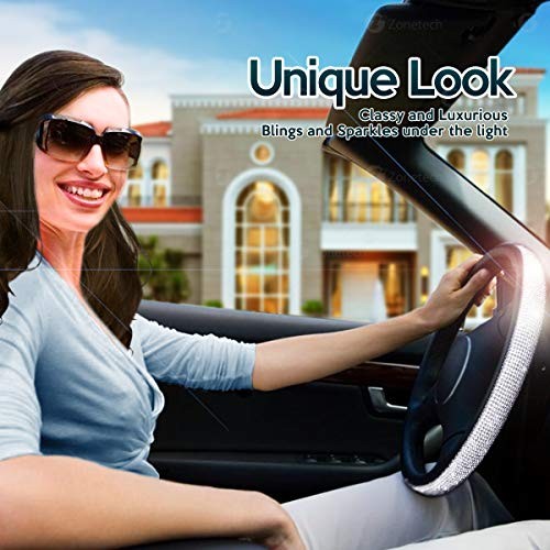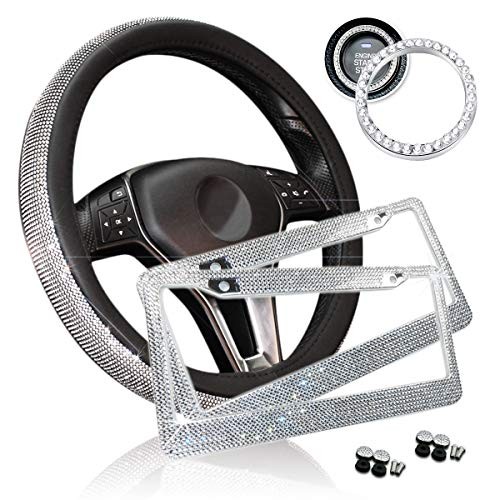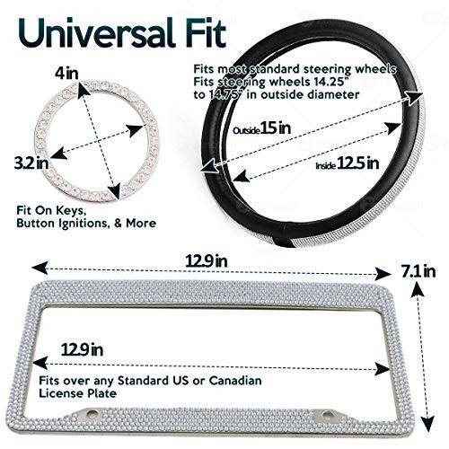 Zone Tech Shiny Bling Car Accessories Set - Premium Quality Crystal License Plate Frame with Mounting Screws, Cystal Steering Wheel Cover, and Ring Emblem Sticker for Button Key and Knobs