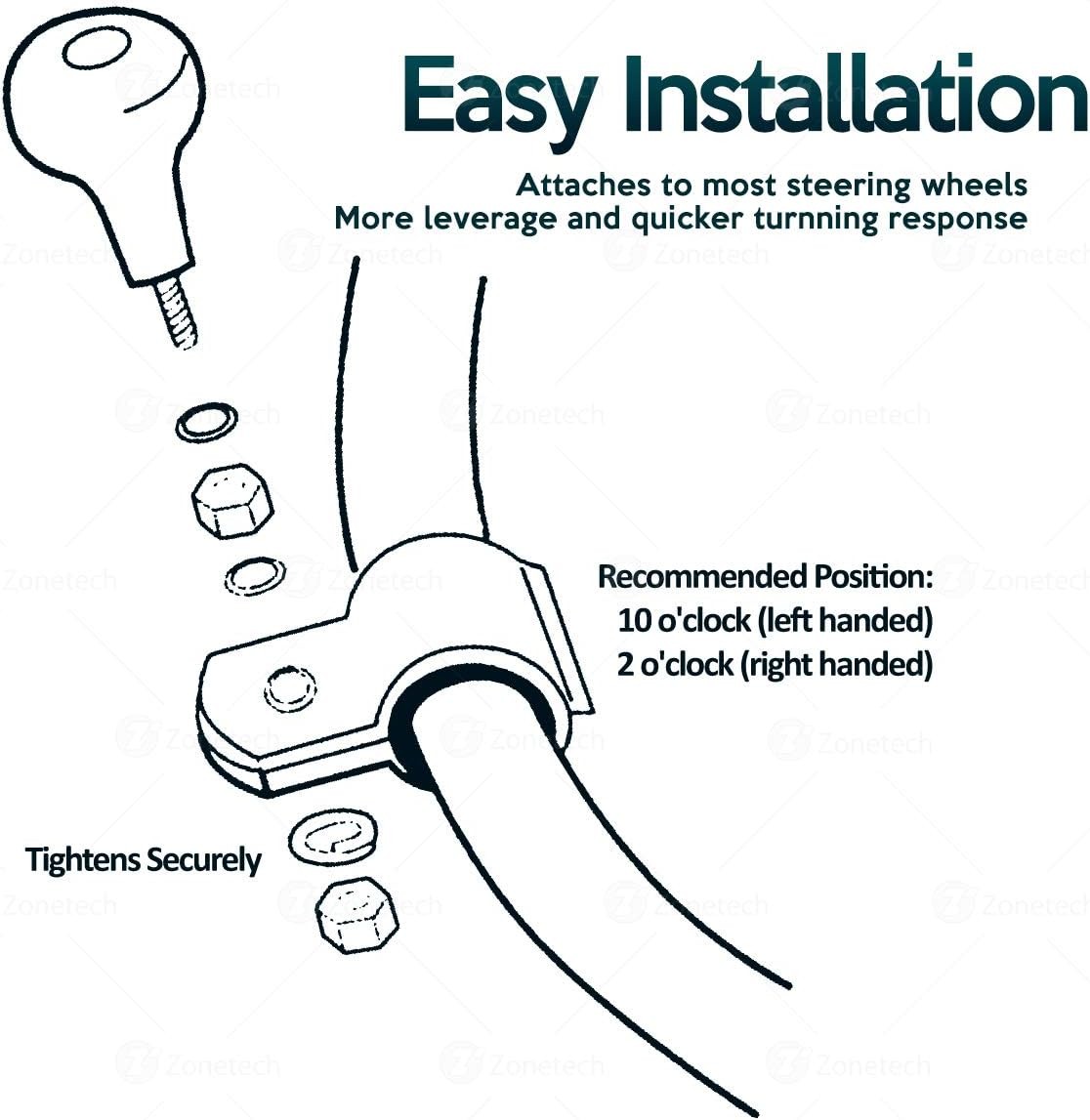 ► INCREASES TORQUE - The Zone Tech steering wheel spinner eases single hand steering through increasing the torque of the steering wheel. This allows smoother turns, especially U-turns, faster parking, safer lane merging and in general handling tight spots. ► POWER HANDLES - The Zone Tech steering wheel spinner gives you the power and ability to pull of some really tight car moves. ► SAFE - The Zone Tech steering wheel spinner is safe to drive with as long as you drive safely. If you exercise with caution and drive safely the Zone Tech steering wheel spinner will only increase car safety. ► PREMIUM QUALITY - The Zone Tech steering wheel spinner is constructed out of premium qualit...View More - Specification