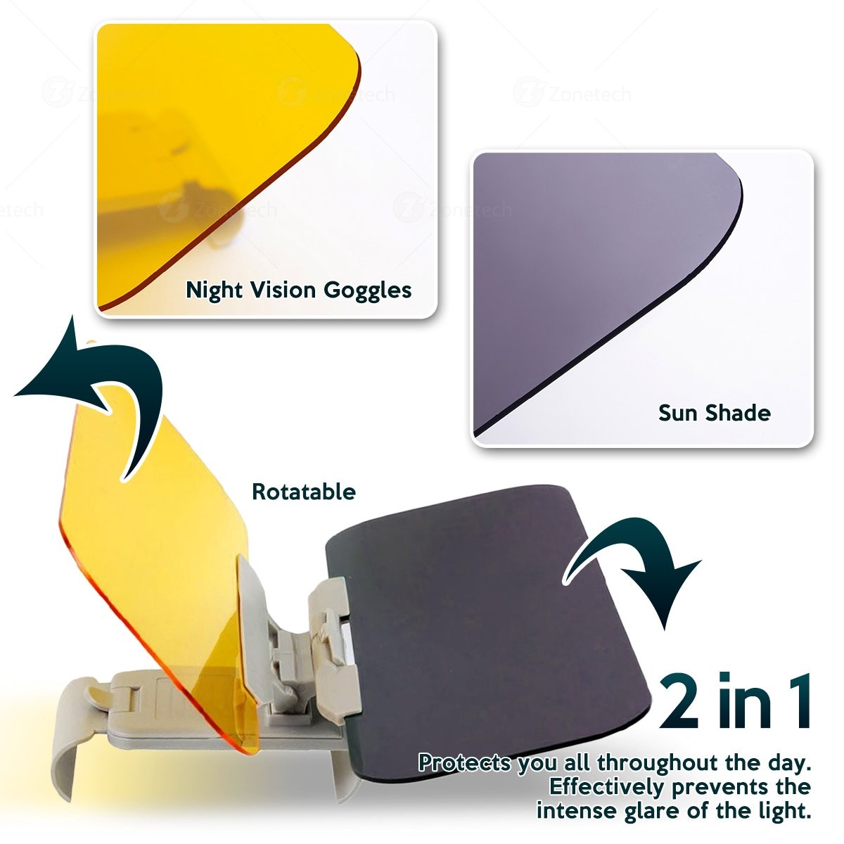 ► EASY INSTALLATION - The Zone Tech car anti-glare visor is very quick and easy to install; just clip it onto your overhead visor. You can easily adjust its position. The visors can be adjusted by rotating 180 degree to accommodate your needs.