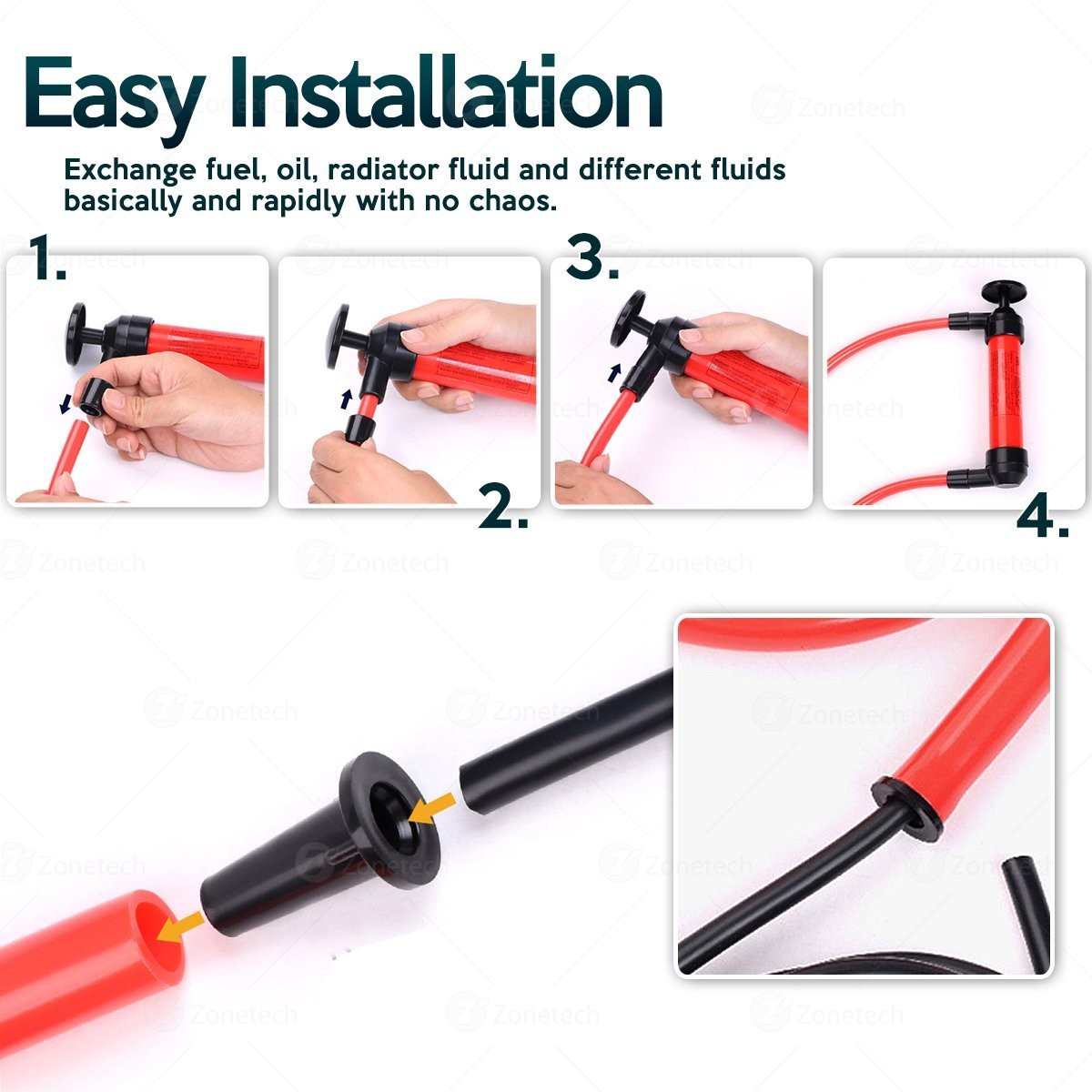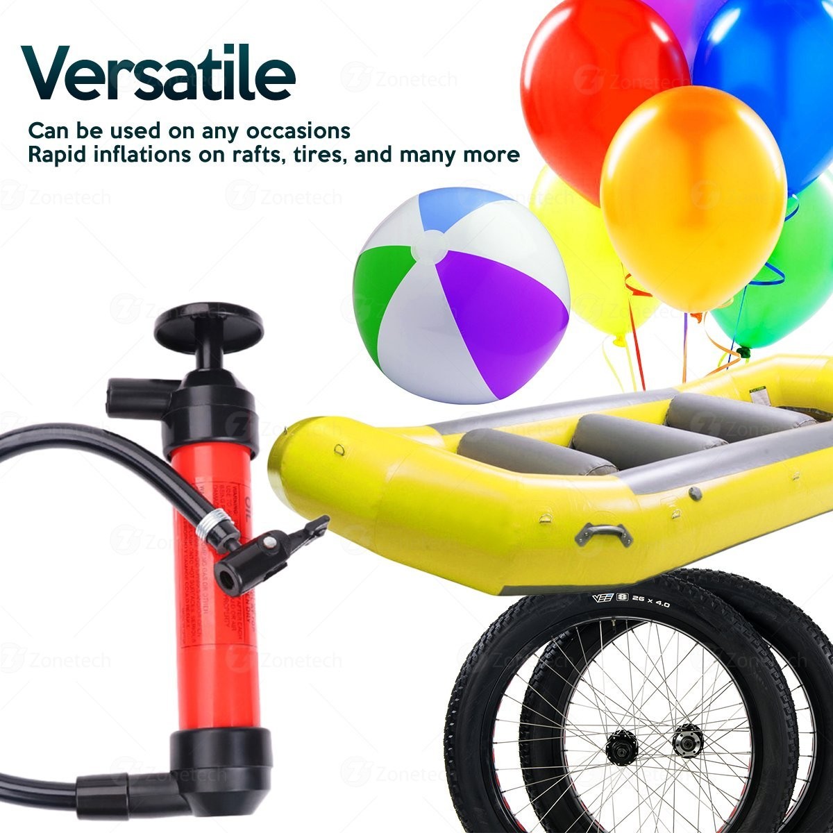 PUMPS FLUID - The Zone Tech 3-In-Pump is one of the most important and practical accessories to always have in your car. With its 200cc cylinder capacity, it pumps gas oil or any liquid into your car as well as air into inflatable objects such as rafts, tires, swimming pools, balloons etc.
