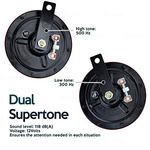 ► LOUD AND POWERFUL - The Zone Tech dual horn blares out a loud and powerful warning. The great bellowing sound catches everyone's attention and is heard all over. The two durable trumpets can produce sound as loud as 118DB. High tone: 400 Hz - Low tone: 335 Hz.