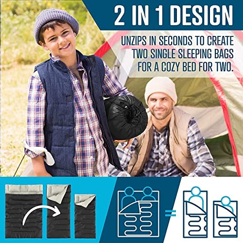Zone Tech 2 Pack Double Camping Sleeping Bag w/Pillows – 3-4 Season Lightweight Waterproof Warm & Cool Weather Adult & Kids Sleeping Bag Converts into 2 Single -Camping, Hiking, Backpacking, Outdoors
