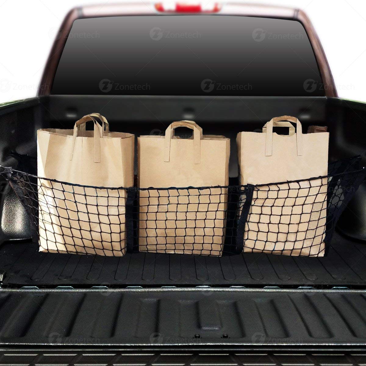 Car Trunk Mesh Cargo Net- Zone Tech 3 Pocket Net- Elastic Storage Universal Automobile Organizer- Stretchable Mesh Truck Bed Basket