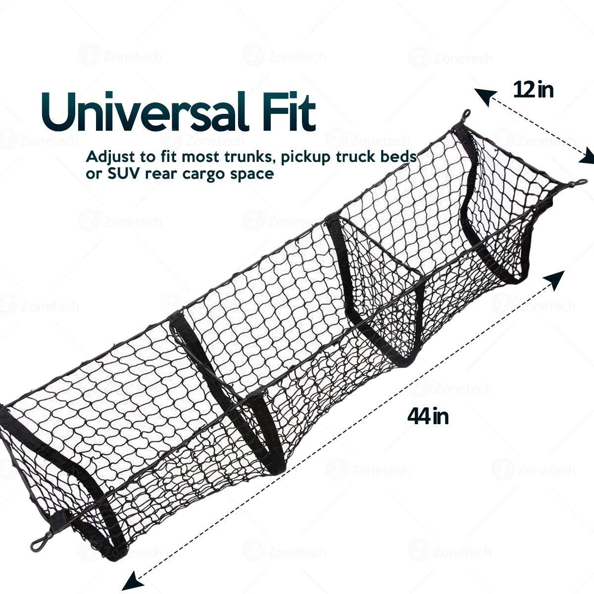 ADJUSTABLE - The Zone Tech storage net can adjust to fit most trunks, pickup truck beds or SUV rear cargo space. This Zone Tech storage net can be adjusted from 44 inch to 56 inch in width, with a 12 inch depth and 12 inch height.