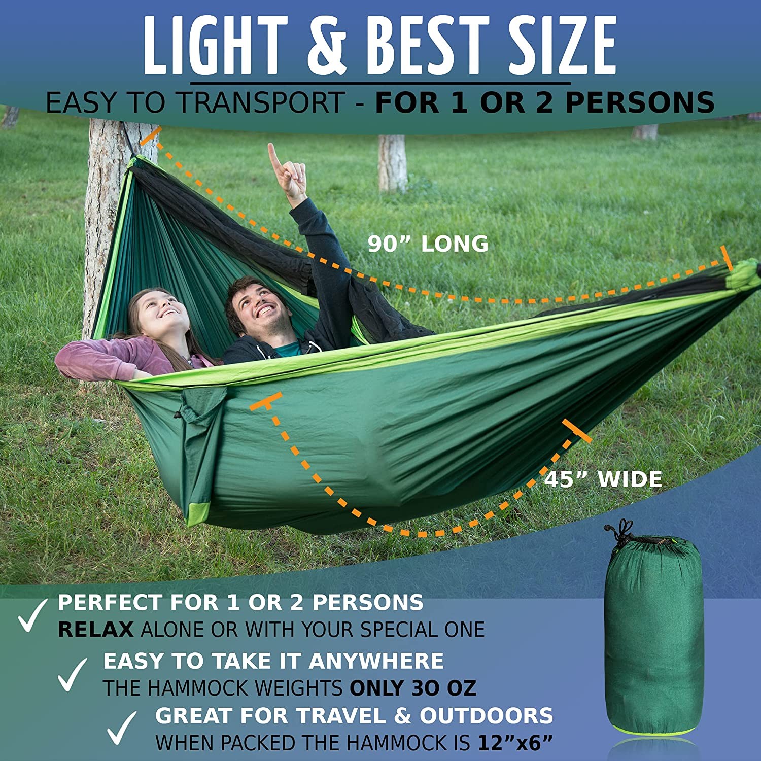 ► DOUBLE SIZE - The Zone Tech travel hammock permits one grown-up to rest serenely and spaciously; It is also suitable for 1 grown-up with 1 kid or 2 kids. ► MOSQUITO FREE - The Zone Tech travel hammock is specially designed open air lounger with high thickness mosquito nets which shield you from every one of those frightening crawlers and different bugs, you can rest soundly outside with security. ► PREMIUM QUALITY - The Zone Tech travel hammock is made with parachute woven 210T Nylon and triple-stitching durable Dacron gauze net that will surely last superbly year after year. ► LIGHTWEIGHT - The Zone Tech travel hammock is unbelievably lig...View More - Specification