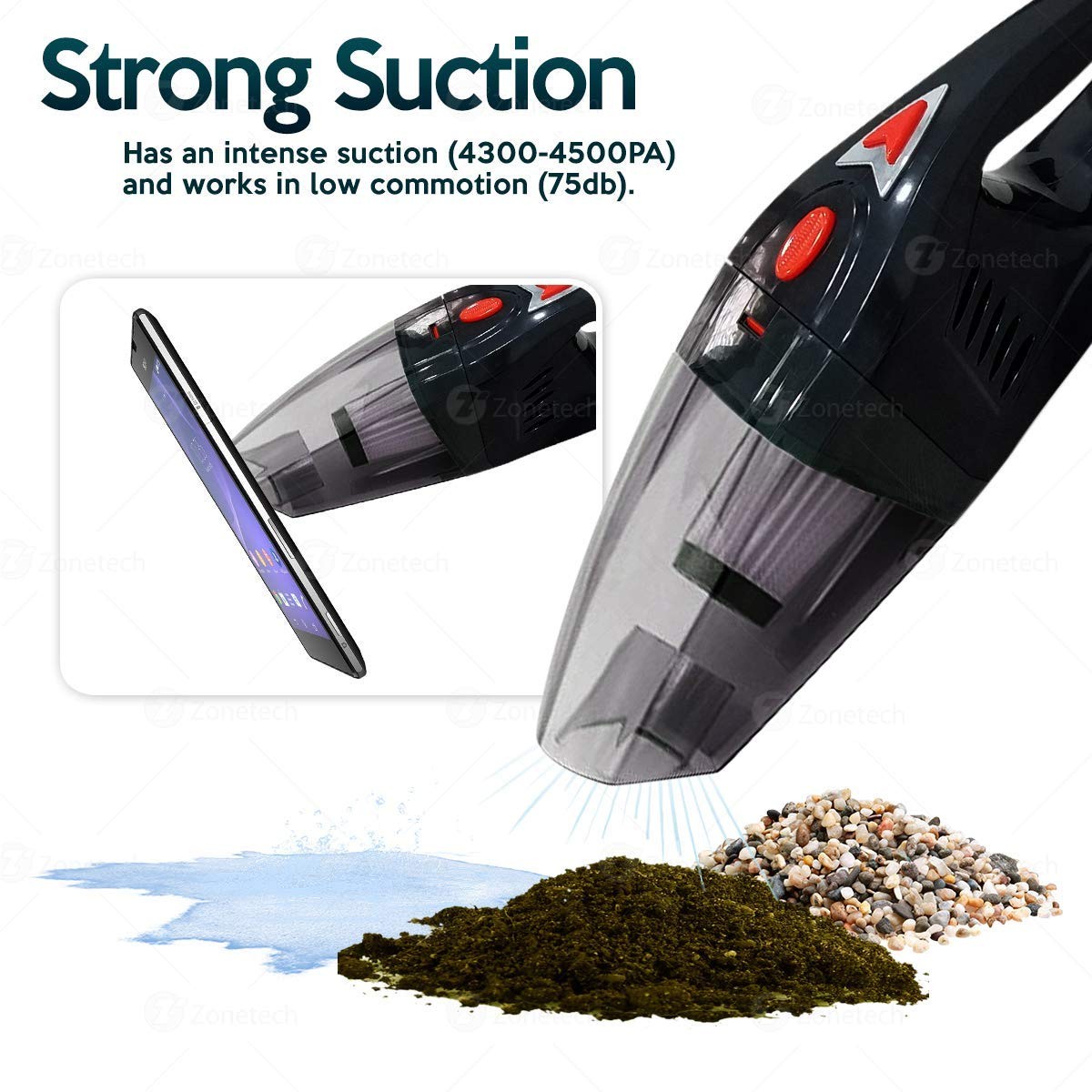 ► STRONG SUCTION - The car vacuum is equipped with a very powerful yet low-pitched suction. Carries only 4300-4500PA suction and 75db low noise. Picks up dust, crumbs, liquid, and many more even a smartphone.