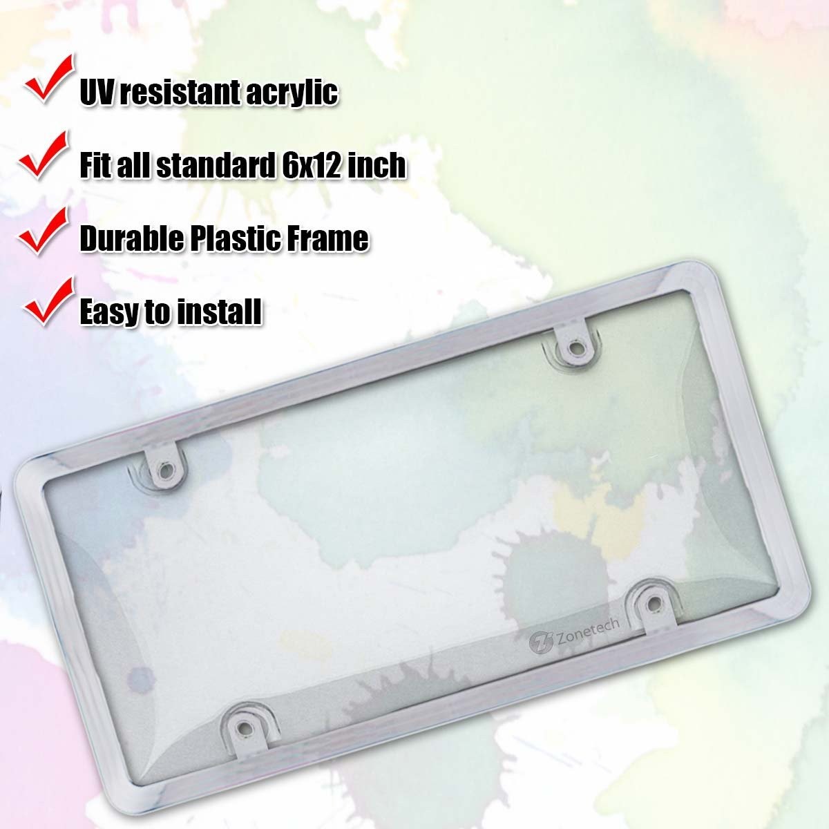 ► CLEAR BUBBLE DESIGN - The Zone Tech license plate shields are lightweight and crystal clear. So clear you can't even tell the license plate has a cover. The clear cover is virtually indestructible. It will not break or shatter. This offers a top of its class in license plate protection. ► PROTECTION - The Zone Tech license plate shields provides protection from the elements and extends away from the plate keeping them looking clean and new. The license plate cover has UV protection helps prevent yellowing and cracking. ► PREMIUM QUALITY - The Zone Tech license plate shields is made from premium quality acrylic with a UV resistant stabilizer to prevent discoloration and to ensure ma...View More - Specification