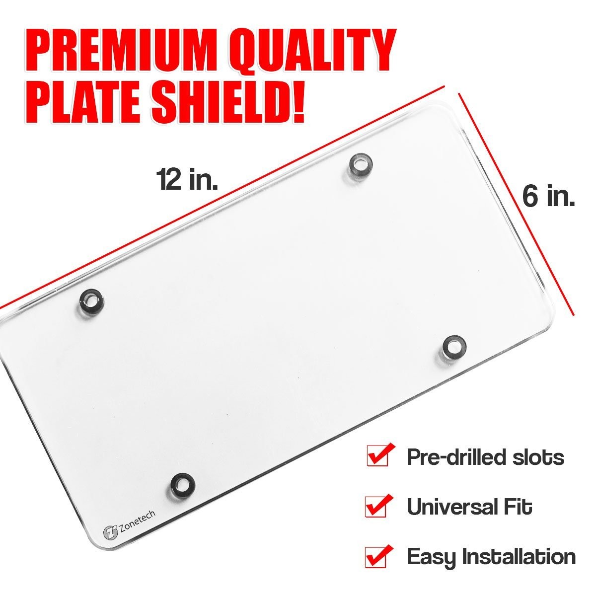 ► CLEAR FLAT DESIGN - The Zone Tech license plate shields are lightweight and crystal clear. So clear you can't even tell the license plate has a cover. The clear cover is virtually indestructible. It will not break or shatter. This offers a top of its class in license plate protection. ► PROTECTION - The Zone Tech license plate shields provides protection from the elements keeping the plate looking clean and new. The license plate cover has UV protection helps prevent yellowing and cracking. ► PREMIUM QUALITY - The Zone Tech license plate shields is made from premium quality polycarbonate with a UV resistant stabilizer to prevent discoloration and to ensure maximum strength and dura...View More - Specification