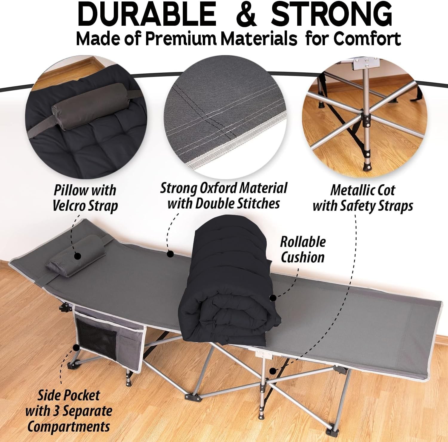 Zone Tech Folding Outdoor Camping Travel Cot and Cot Pad - Premium Quality Lightweight Portable Heavy Duty Adult & Kids Travel Cot w/Large Pocket and Cushion (Gray Cot & Black Cot Pad, 1-Pack)