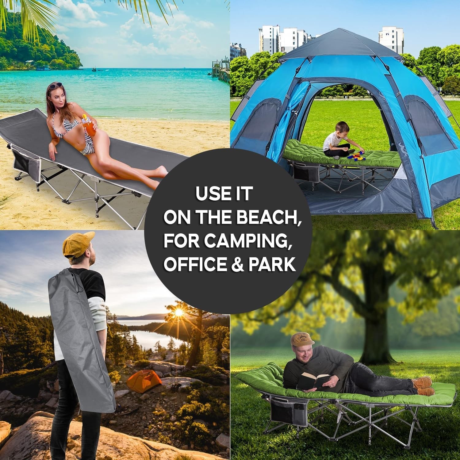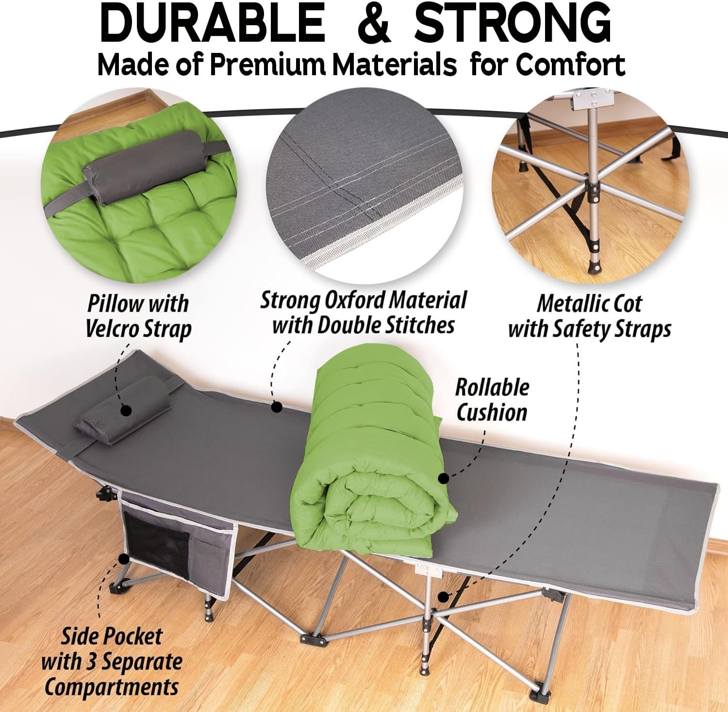 Zone Tech Folding Outdoor Camping Travel Cot and Cot Pad - Premium Quality Lightweight Portable Heavy Duty Adult & Kids Travel Cot w/Large Pocket and Cushion (Gray Cot & Green Cot Pad, 1-Pack)
