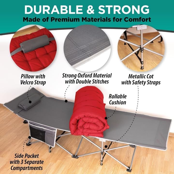 Zone Tech Folding Outdoor Camping Travel Cot and Cot Pad - Premium Quality Lightweight Portable Heavy Duty Adult & Kids Travel Cot w/Large Pocket and Cushion (Gray Cot & Red Cot Pad, 1-Pack)
