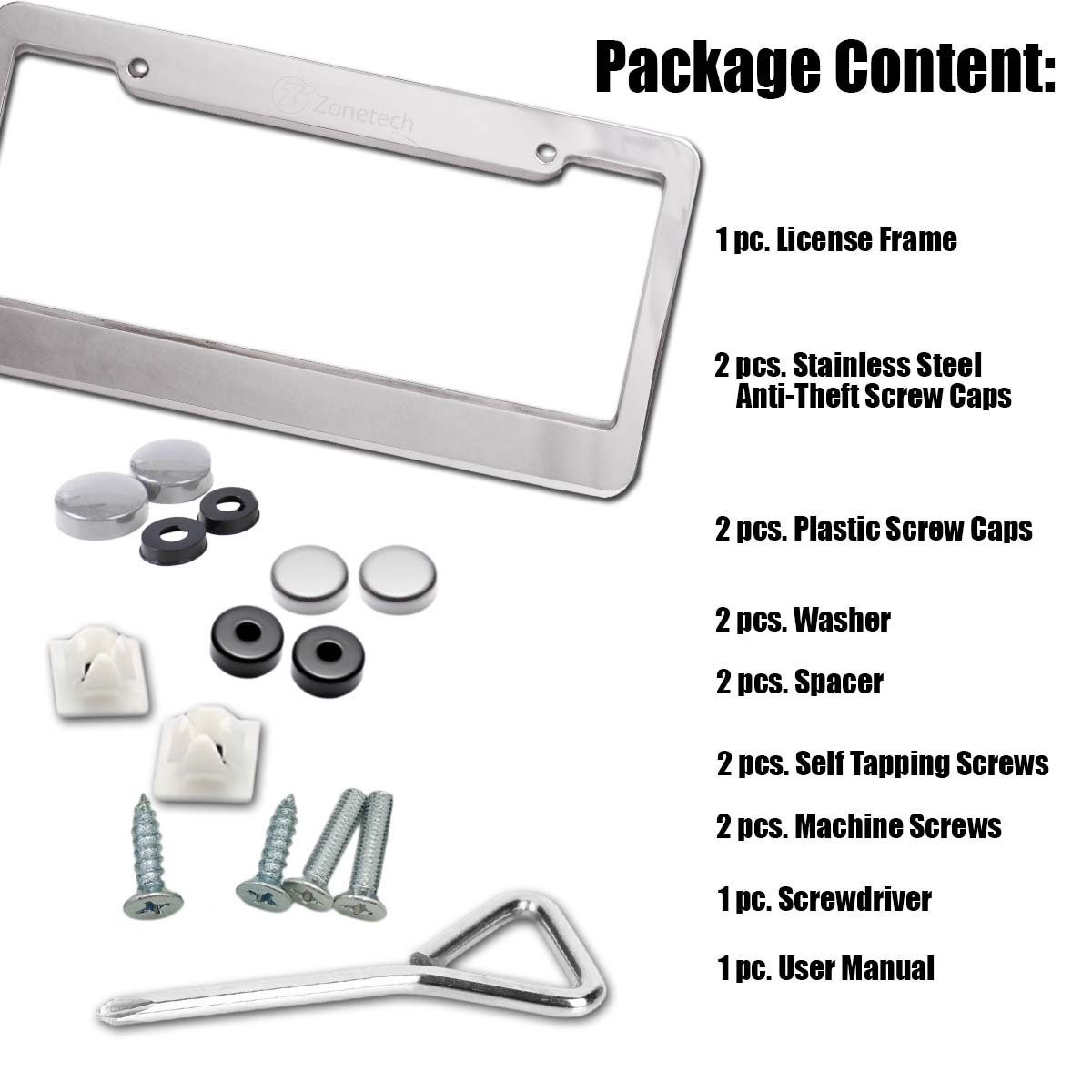 ► SMART DESIGN - The Zone Tech license plate frame is designed not to block registration tags in all four corners. ► DURABLE - The Zone Tech license plate frame is lightweight, strong, and rust-free. It is powder coated black matte finish, so it will never peel off. ► PREMIUM QUALITY - The Zone Tech license plate frame is made from premium quality aluminum to ensure maximum strength and durability for long lasting usage. ► USER FRIENDLY - The Zone Tech license plate frame is user friendly and is easy to install. See back of package for installation instructions. It installs in minutes with no special tools required. ► STANDARD FIT - The Zone Tech license plate frame is designed...View More - Specification